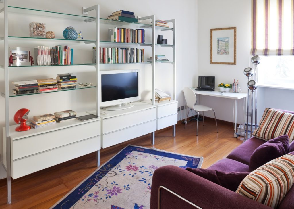 Lo studio, accessibile dal disimpegno della zona notte, è arredato, oltre che con la postazione studio – sistemata vicino alla finestra – anche con un divano trasformabile. L’ambiente diventa quindi all’occorrenza stanza per gli ospiti o salotto per guardare la tv.